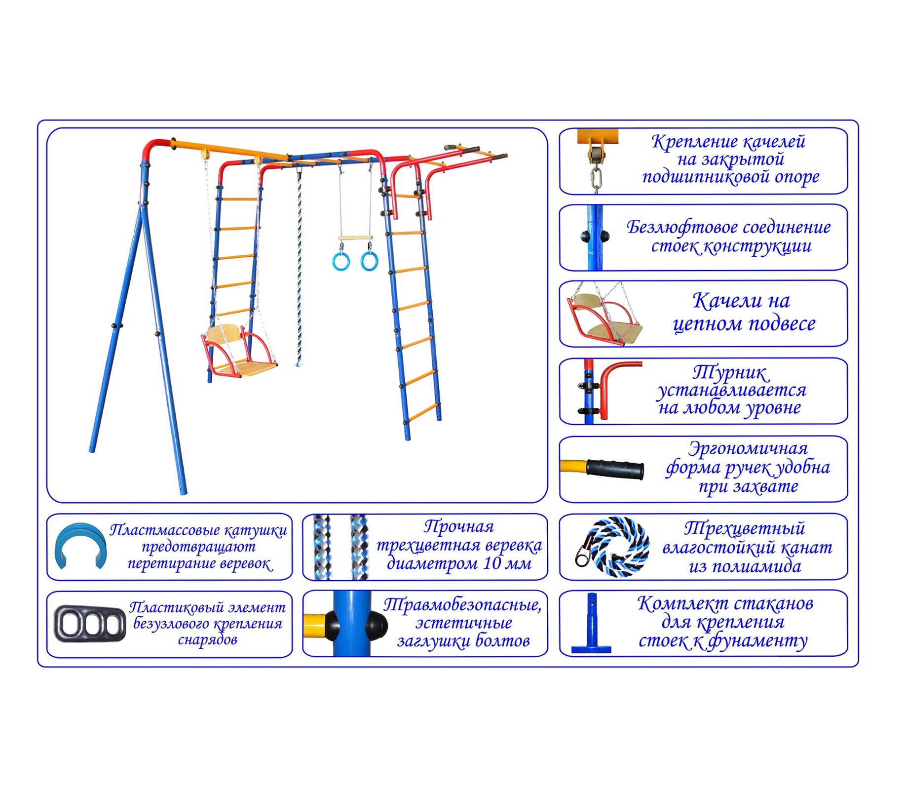 Комплектация: Качели, кольца с перекладиной, канат, турник