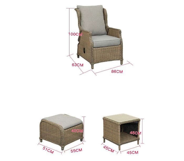 Размер изделия (габариты ДхШхВ), см: Кресло - 63х86х100; столик - 45х45х45; пуфик - 51х55х42